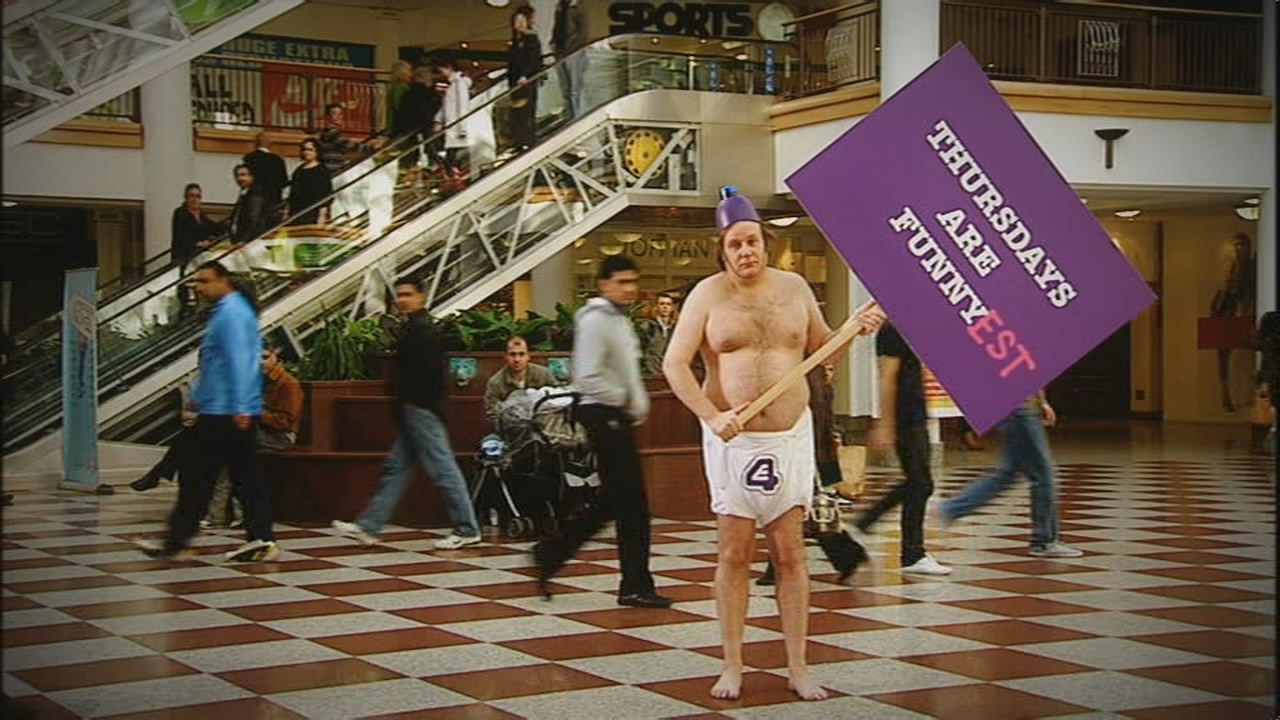 A trailer from E4 advertising a raft of new shows to the channel. All airing on Thursday, they'd branded the strand 'Thursdays are Funnyest', and filmed a man with a sign in several different locations. Voiceovers on E4 trailers at this point were still provided by the well-known Peter Dickson. A veteran of the voiceover industry, he provided the voiceovers (and even appeared occasionally invision) for nearly every E4 trailer from 2006, before eventually being quietly phased out around 2010. After many years off, he started voicing some new trailers for the station in late 2016.