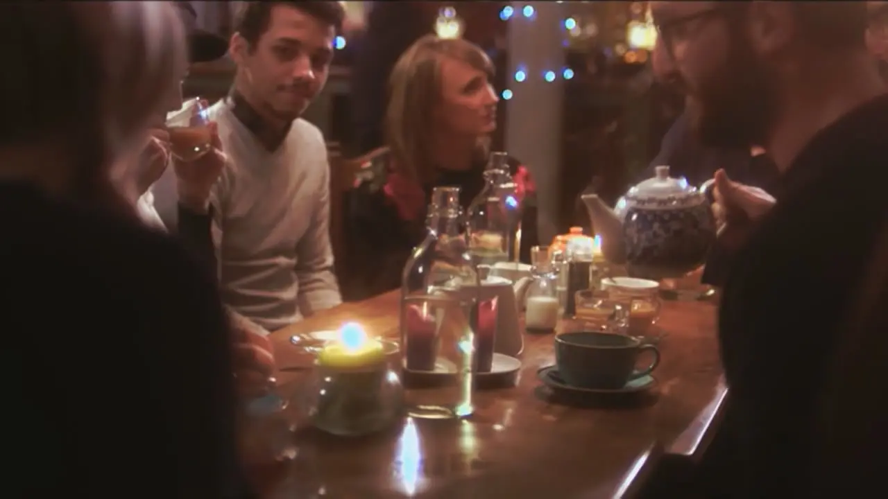 STV's Christmas 2018 idents started airing on December 8th, and featured a mix of both the previous year's Christmas idents, as well as those of STV2 from 2017 now re-edited for the main channel. One of the ex-STV2 idents here used to first open up the day at 9.25 on the 8th, featuring people at dinner parties and putting on ice-skates.