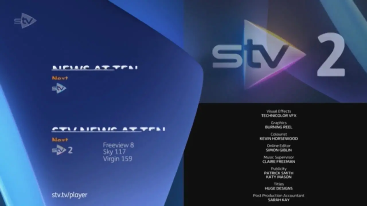 The ECP style for STV is very similar to that of the main ITV network, which makes sense given they're cutting over an end credits already designed for that template of promotion. Once again it allows for cross promotion of channels, usually used to effect to promote things coming up on STV2 as well.
