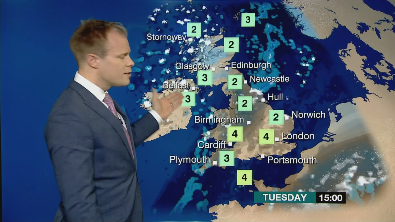 In 2005, the traditional weather symbols were dropped from the BBC in favour of more realistic maps designed to show weather more accurately. The newly introduced graphics remained in use with small tweaks for the next decade, right through until 2013 where this clip dates from. Shown shortly before 1pm on 18/3/2013, Stav Danaos presents the last weather bulletin broadcast on the news channel to come from Television Centre before their move to New Broadcasting House alongside the main news team.